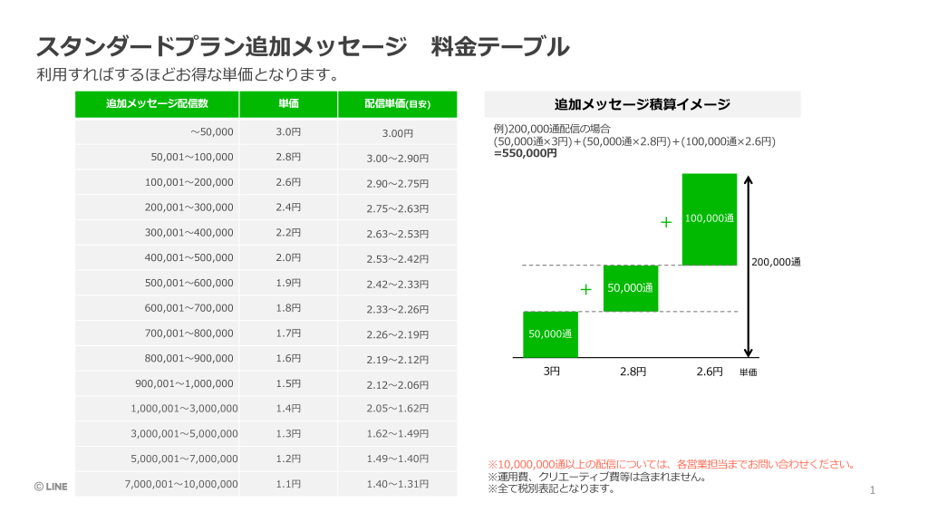 LINE公式アカウントのスタンダードプランでは、月間30,000通の無料メッセージが含まれています。また、追加メッセージのうち最初の50,000通までは旧料金・新料金ともに同じ単価(3円)が適用されます。