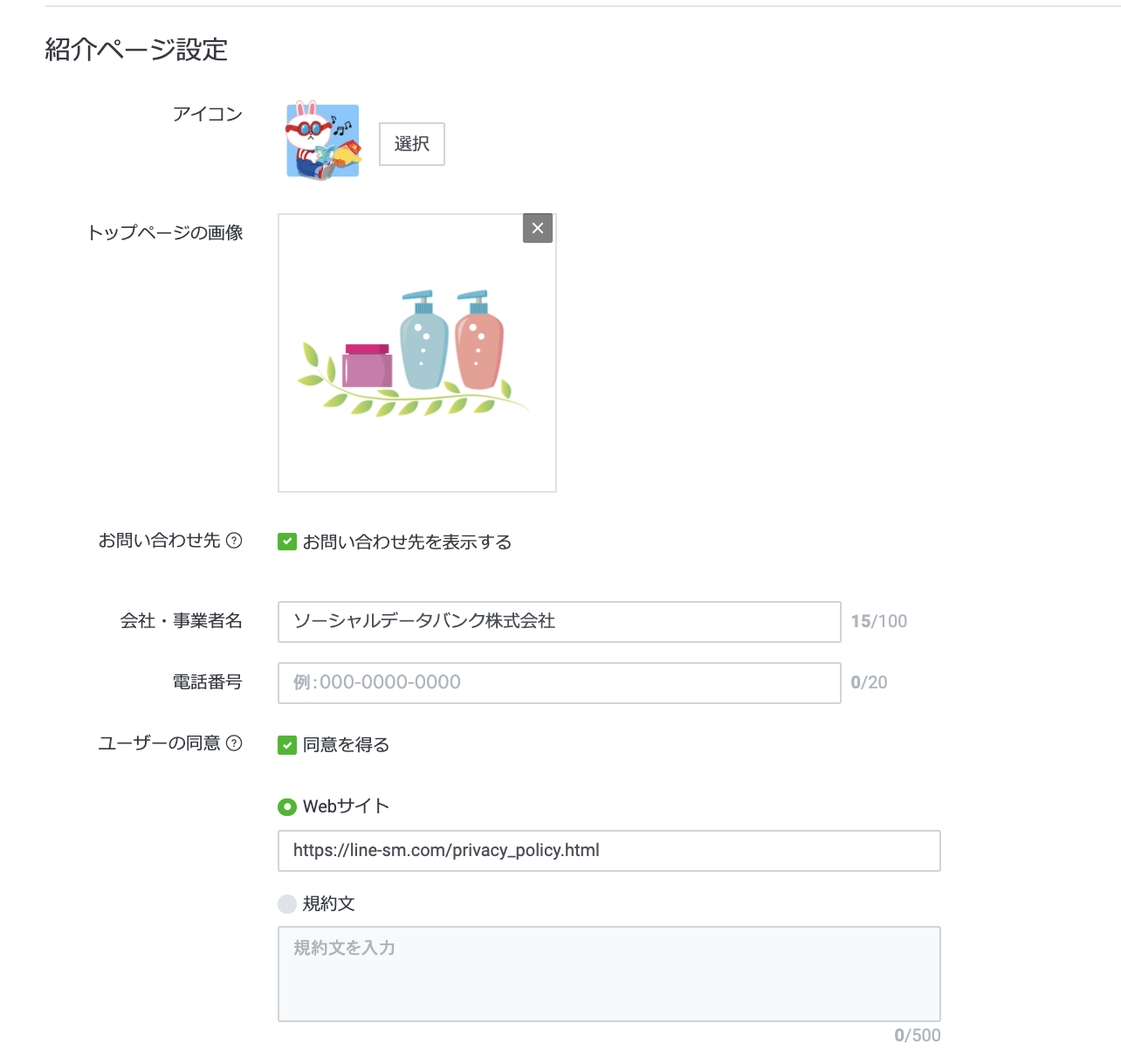 次は紹介ページです。アンケートの回答前に、ユーザーの同意を得る場合や、お問合せ先を表示したい場合は設定します。