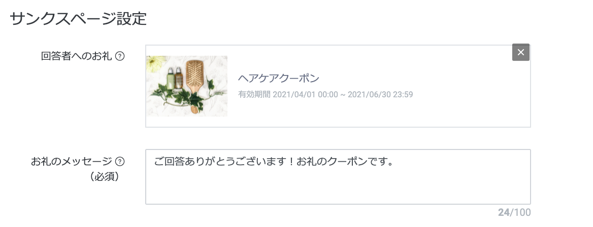次は、サンクスページの設定です。アンケートに回答してくれた人へのお礼の設定です。「メッセージ」と「クーポン」を設定できます。クーポンの設定は任意です。