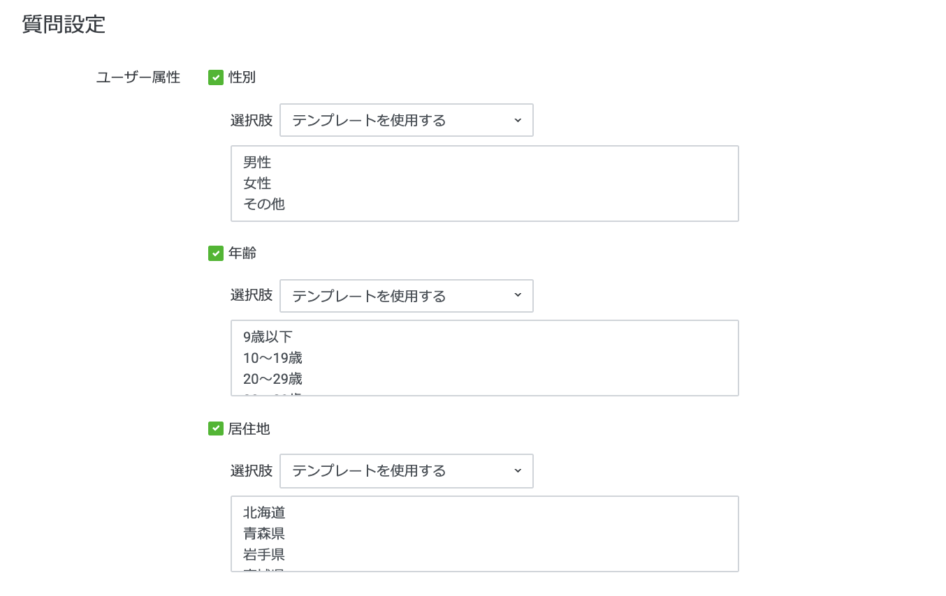 次に、質問内容を設定していきます。ユーザーの属性(性別/年齢/居住地)に関する質問は、用意されているテンプレートを利用できます。