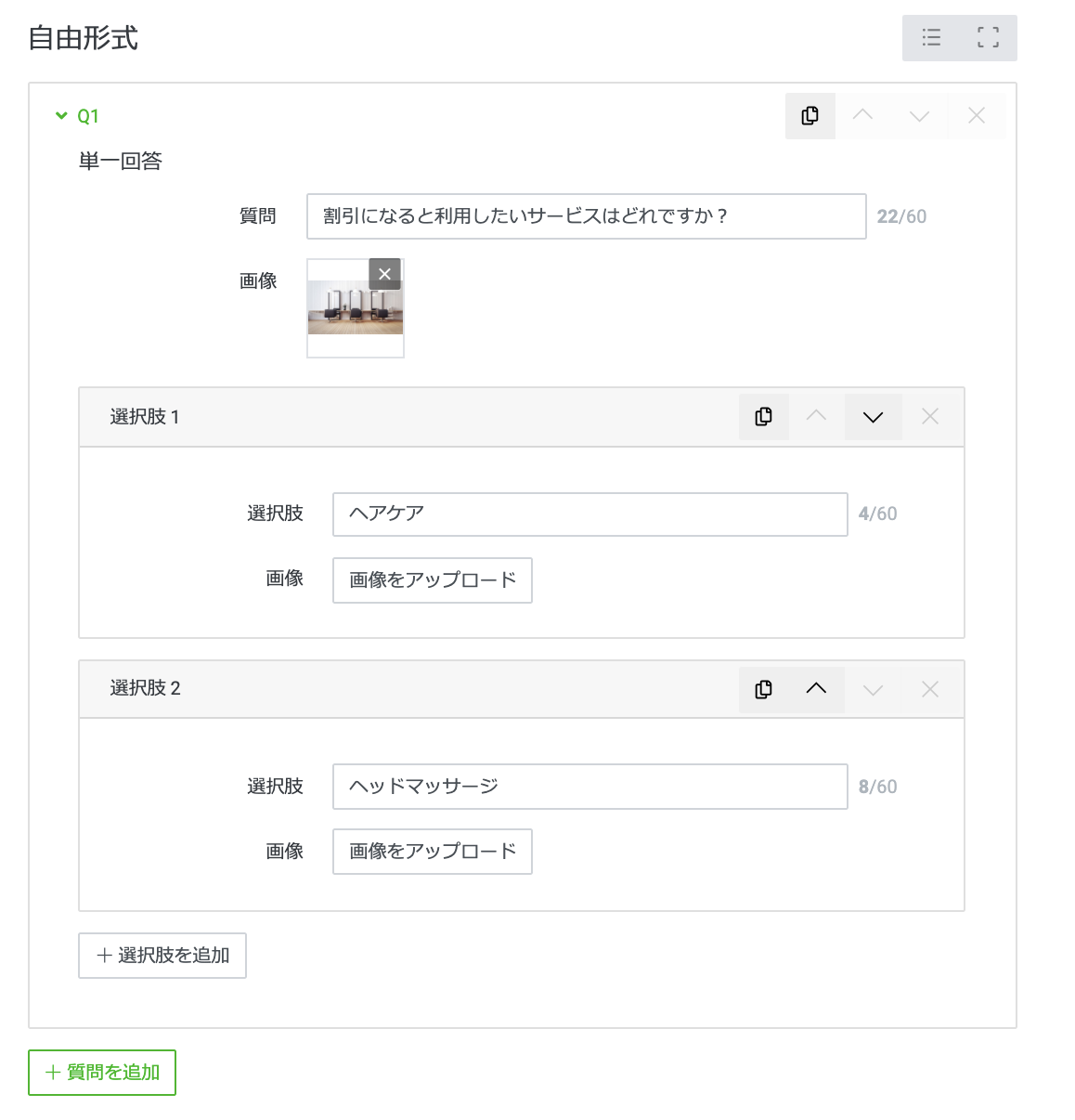 選択肢を作成する。選択肢と質問は追加していくことも可能。