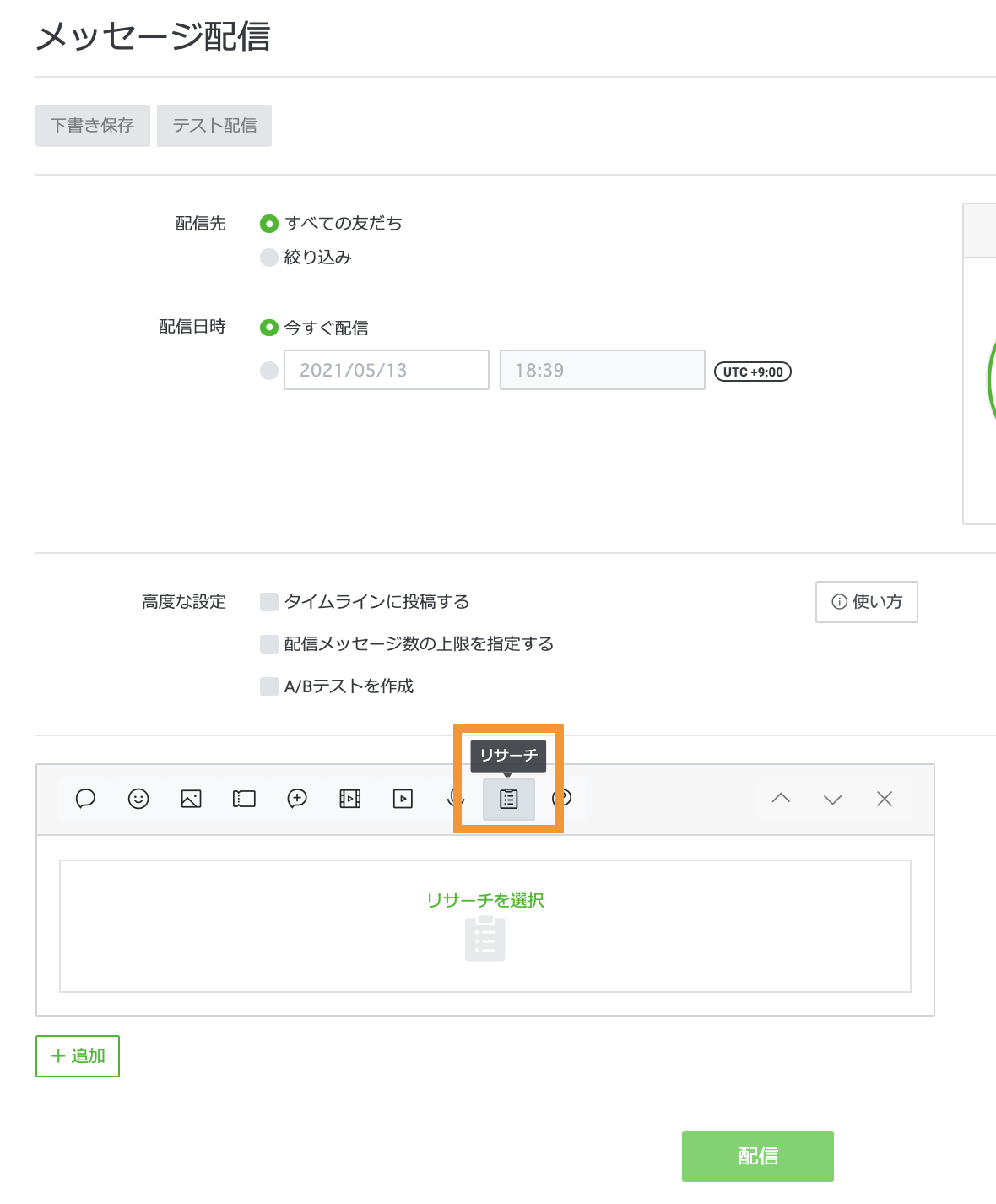 作成したアンケートは、メッセージ配信から送信します。メッセージ配信の「リサーチ」を選択して、作成したアンケートを選び、「配信」をクリックすると友だちにアンケートが送られます。