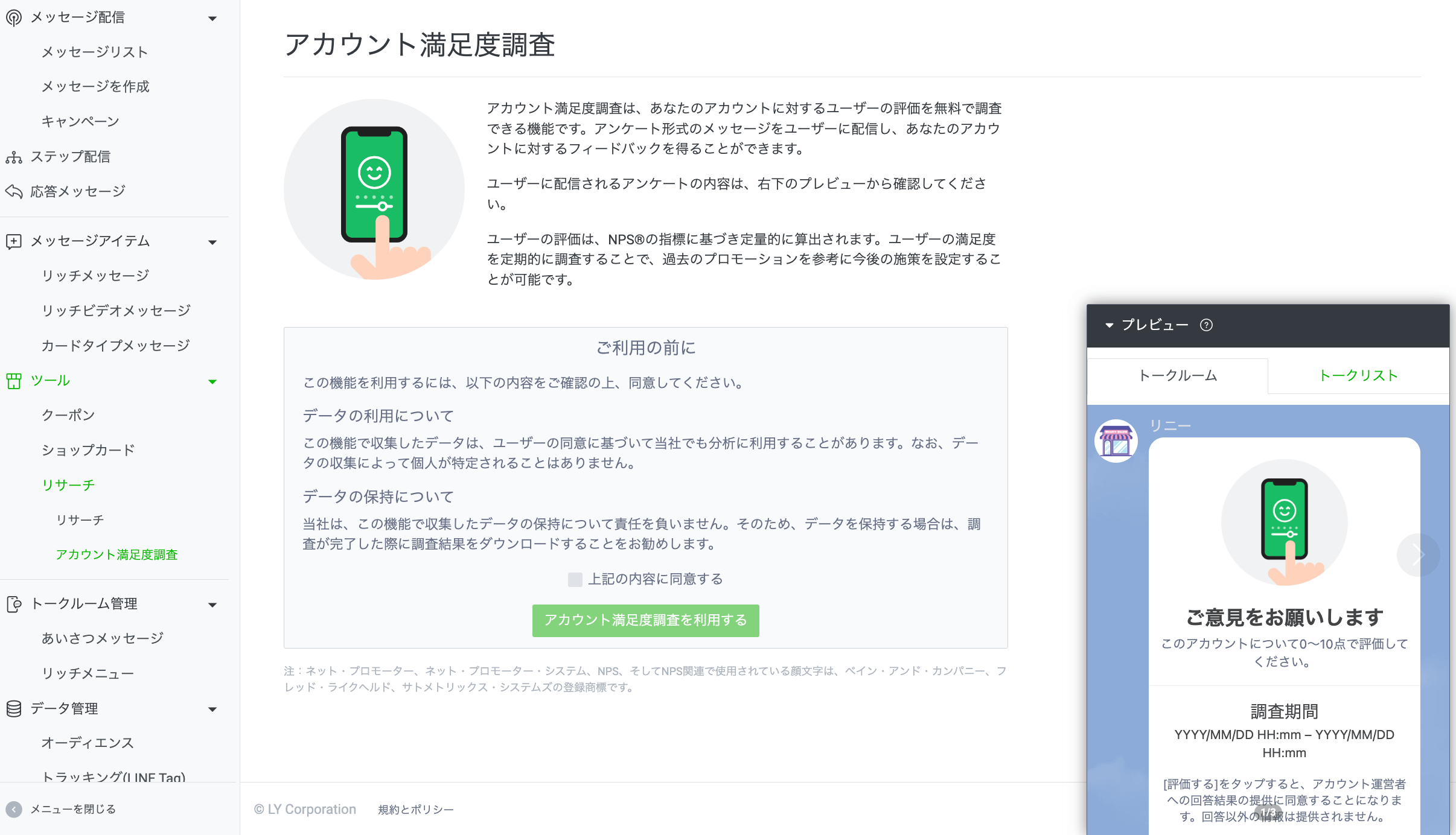 LINE公式アカウントのリサーチ機能に関連して「アカウント満足度調査」機能についてもご紹介します。