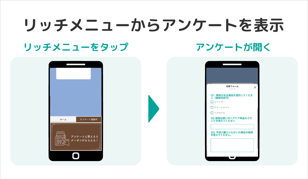 Linyを使うと、メッセージとしてアンケートを送付するだけでなく、リッチメニューをタップしてアンケートを開くことが可能なため、ユーザーが容易にアンケートへアクセスできます。