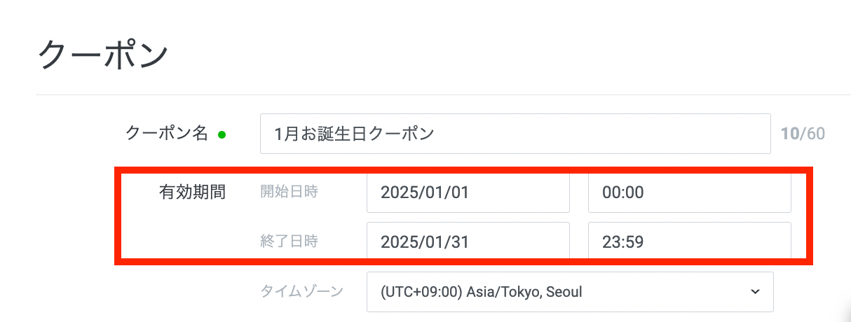 例えば、クーポンの有効期限を1ヶ月に設定して、月初にその月のお誕生日の方にクーポンを配信する場合は、「1月用のクーポン」「2月用のクーポン」・・・と作成することになり、12個のクーポンの作成が必要です。