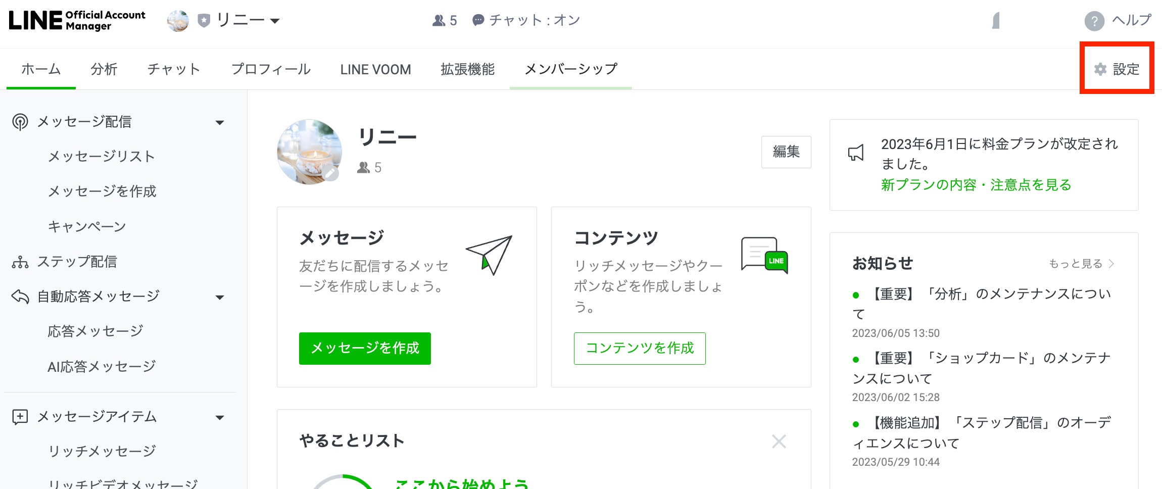 LINE公式アカウントの料金プランの変更は、管理画面の「設定」>「月額プラン」から可能です。