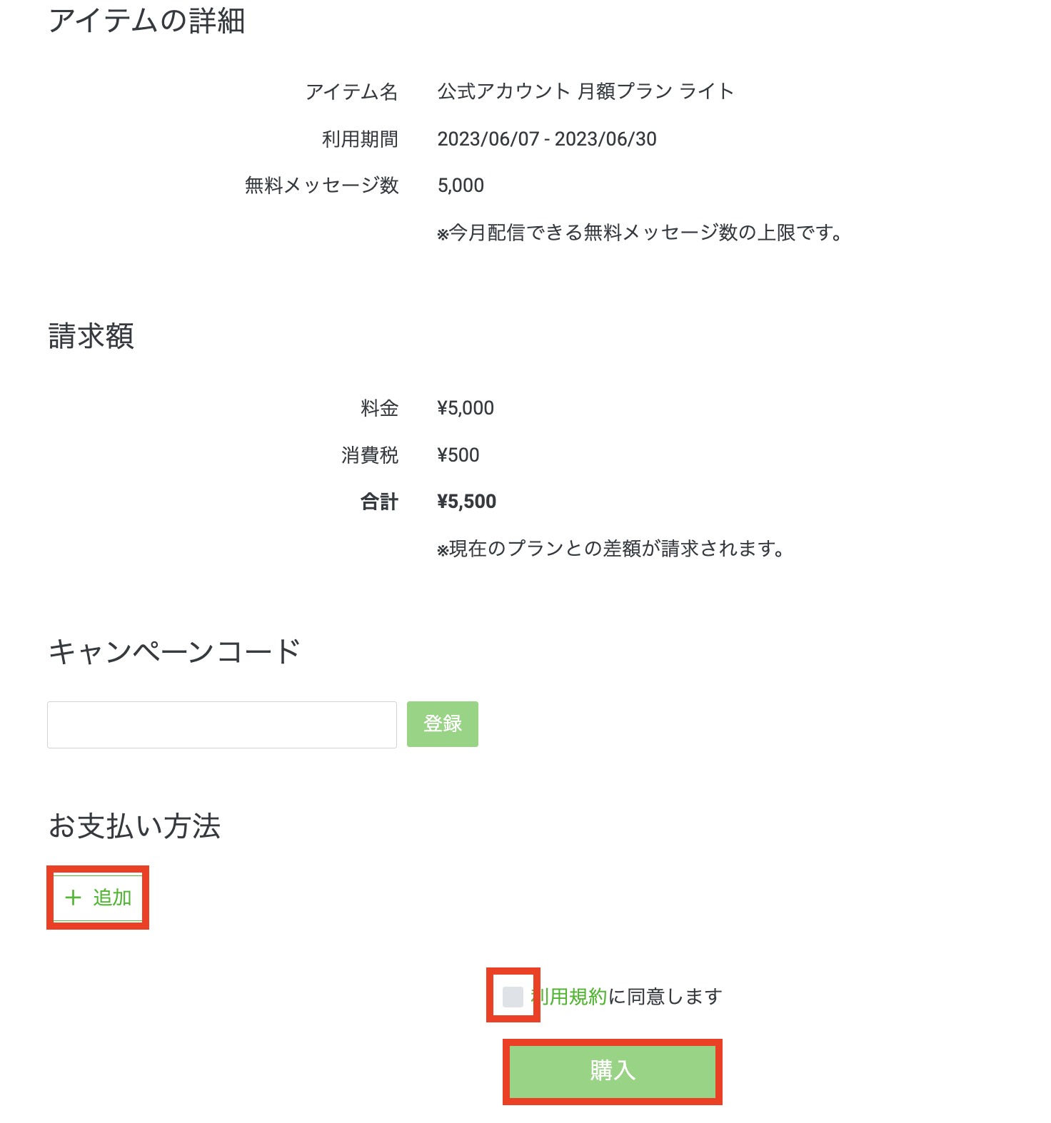 変更内容を確認し、「お支払い方法の設定」と「規約の確認」を行い、「購入」をクリックします。