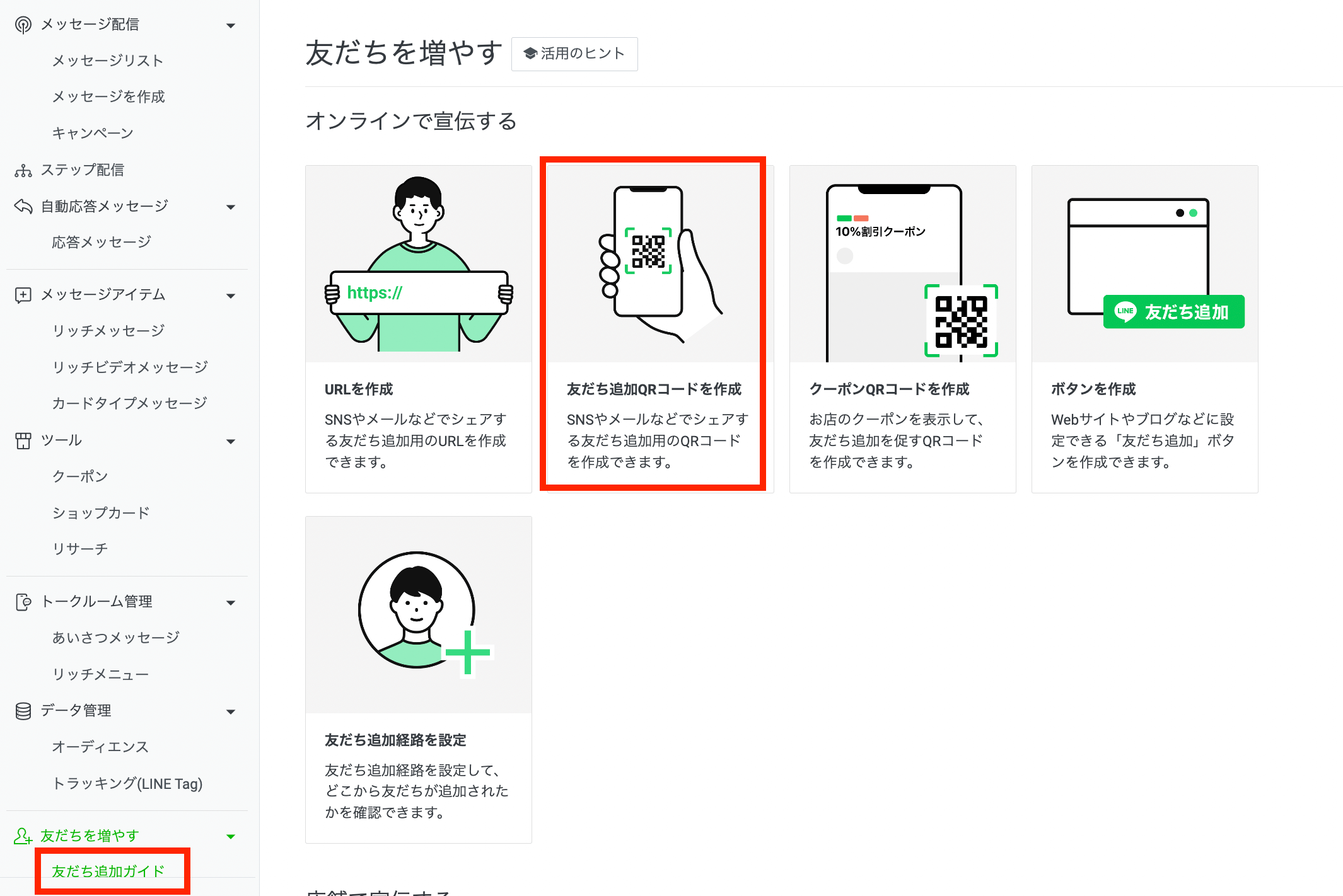 QRコードは、LINE公式アカウントの管理画面 > 【友だちを増やす】> 【友だち追加ガイド】> 【QRコードを作成】からダウンロードできます。