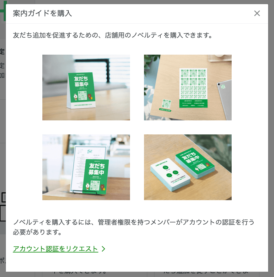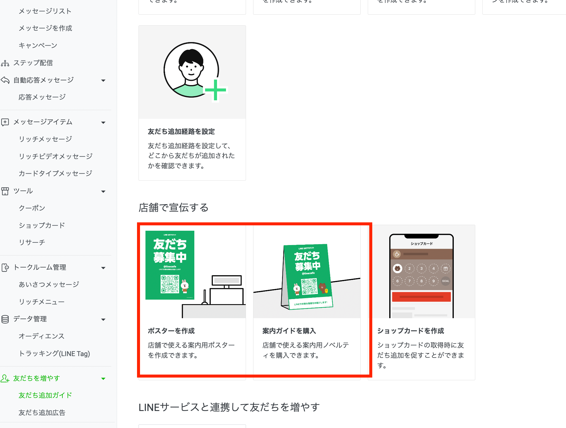また、同じ【友だち追加ガイド】画面内で、【ポスターの作成】を選ぶと、ポスターがダウンロードできます。【案内ガイド】は、ポップやノベルティなどを購入することができる機能です。案内ガイドは、認証済アカウントのみ利用が可能です。