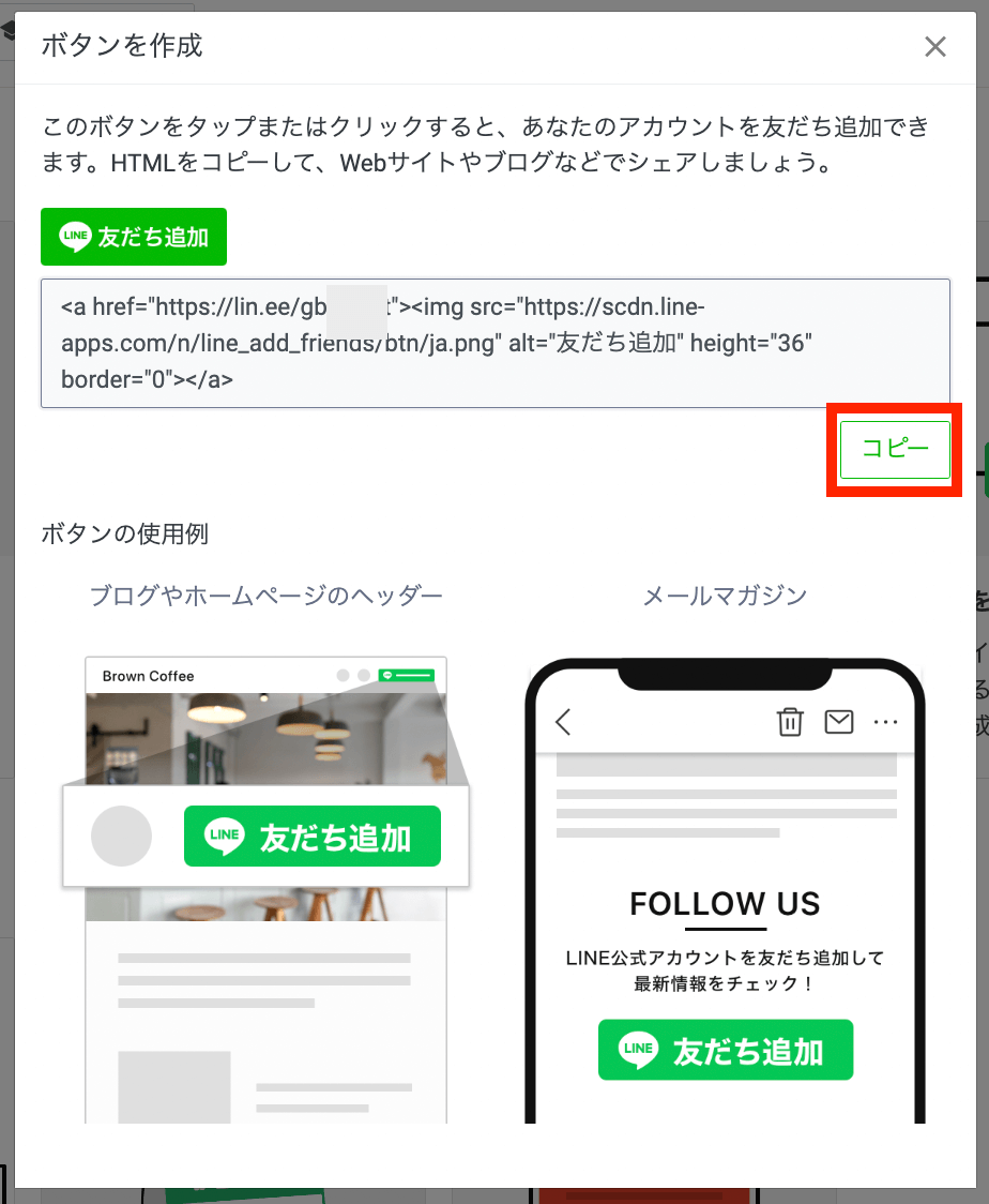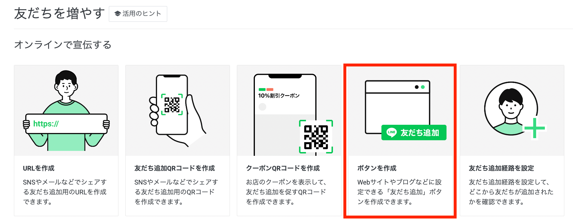 友だち追加ボタンは、LINE公式アカウントの管理画面 > 【友だちを増やす】> 【友だち追加ガイド】> 【ボタンを作成】から、「友だち追加ボタンのコード」をダウンロードできます。