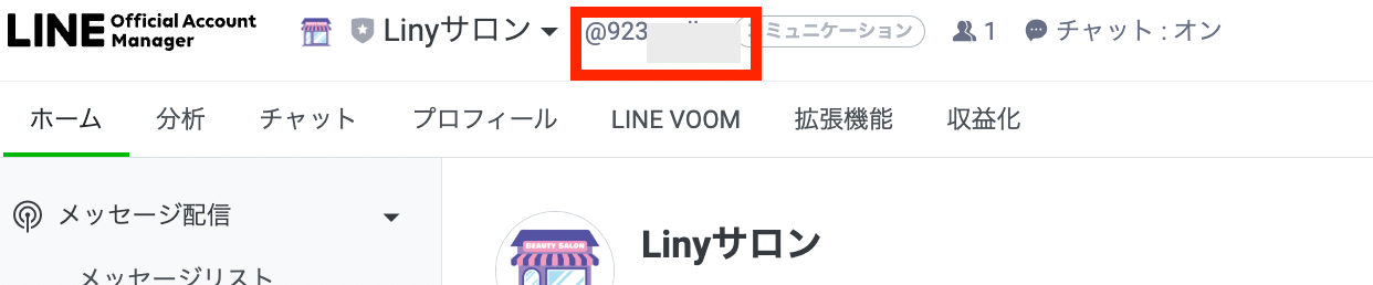 LINE公式アカウントのIDは、PCもしくはスマホアプリを開き、アカウントを選択した後、ホーム画面の上部で確認できます。