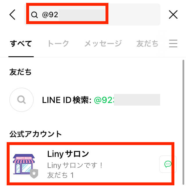 LINE公式アカウントには個別のIDがあります。そのIDをユーザーに伝え、ユーザーがLINEアプリの「ホーム」や「トーク」などの検索ボックスに、該当のLINE公式アカウントのIDを入力して検索して友だち追加することも可能です。