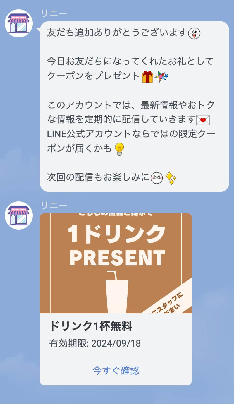 店舗がある場合、友だち追加クーポンを活用することで、店頭での声かけや友だち追加キャンペーンの成果を高めることができます。その理由は、"今すぐ" お得になると感じてもらいやすいからです。例えば、「友だち追加したらその場でドリンク1杯無料」「今日のお会計を10%OFF」などを企画することで、その場で友だちを増やすことが自然にできます。ポイントは、"今すぐ" お得になるという点なので、「次回のお会計時」や「次回ご利用時」ではなく、すぐに使えるプレゼントを考えてみましょう。