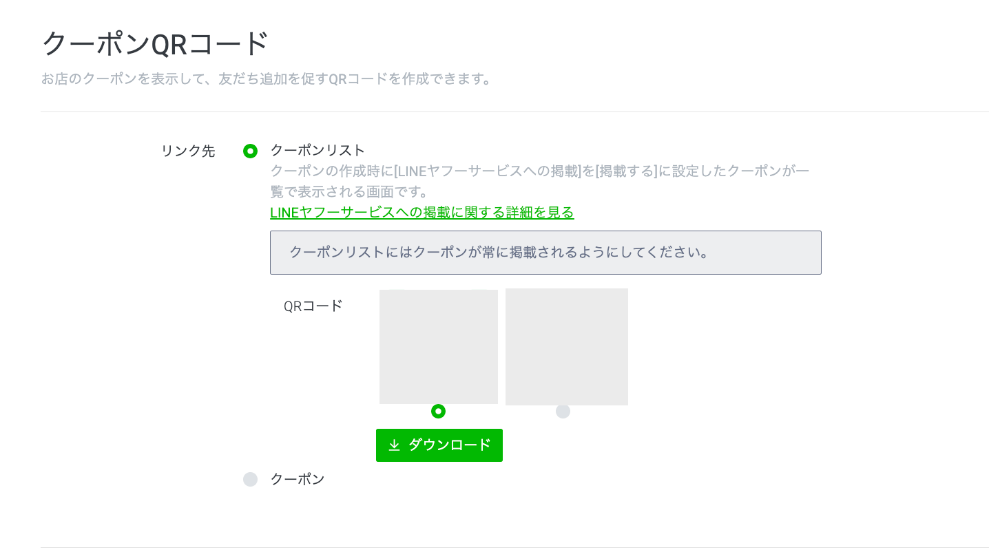 2025年7月の仕様変更によって、この方法で有効なクーポンリストを作成できるようになりました。複数クーポンの一覧を表示させるQRコードが作成可能です。(注意:クーポンリストを作成する場合は、クーポンの作成時に「LINEヤフーサービスへの掲載」を「掲載する」に設定したクーポンが必要です。)