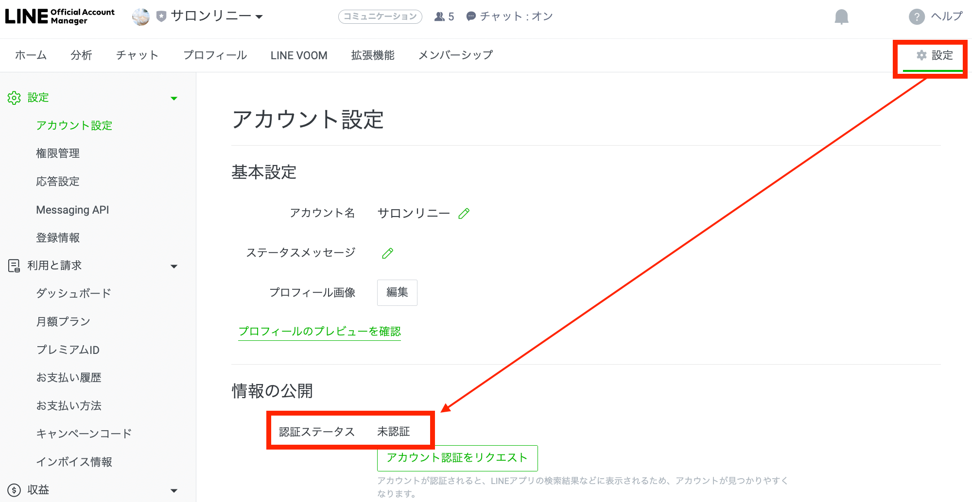 LINE公式アカウントにログインし、該当のアカウントを選択します。右上の【設定】> 【認証ステータス】から確認が可能です。