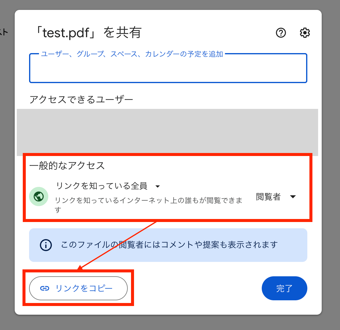 アクセス権限を設定・確認します。その後、「リンクをコピー」クリックします。