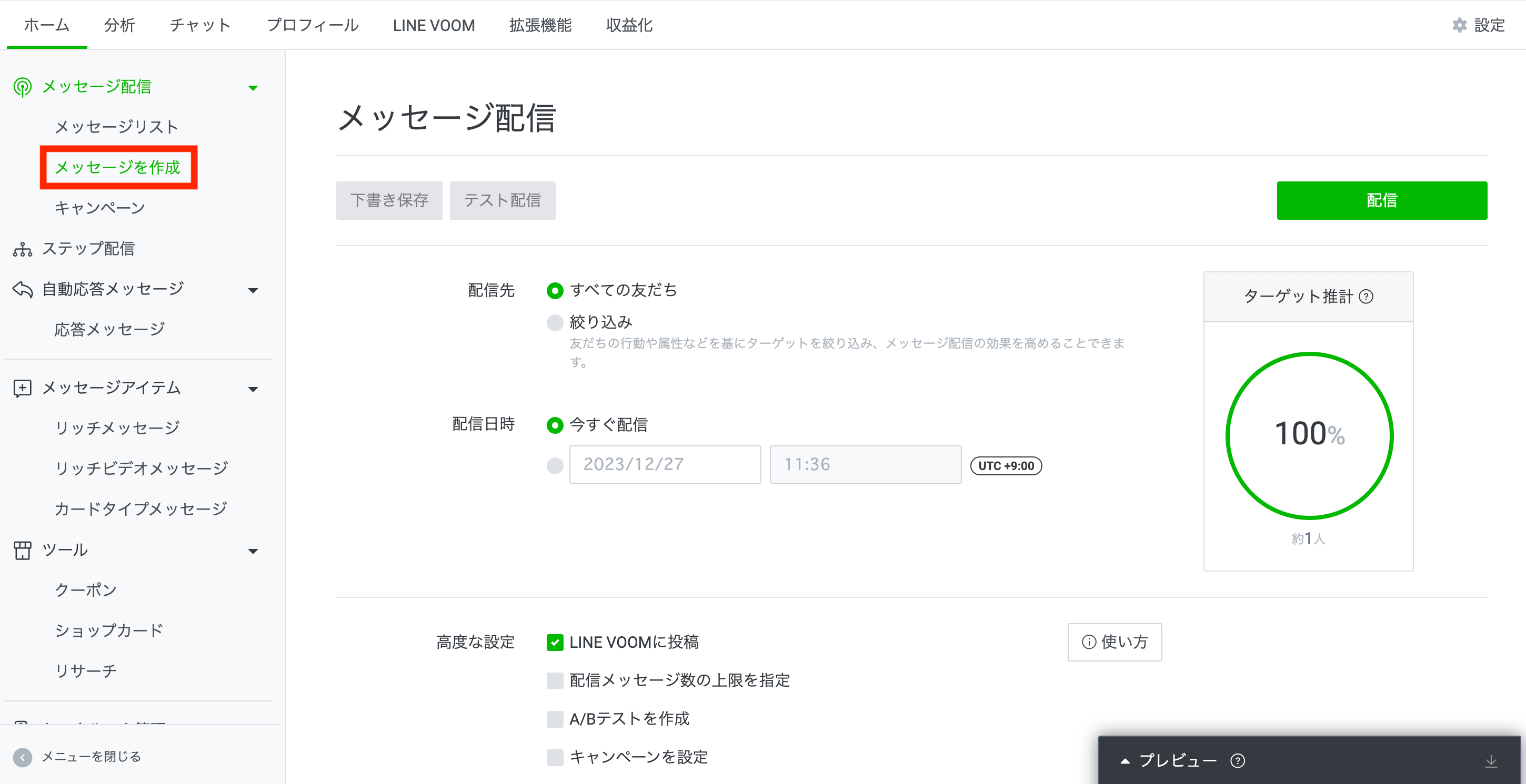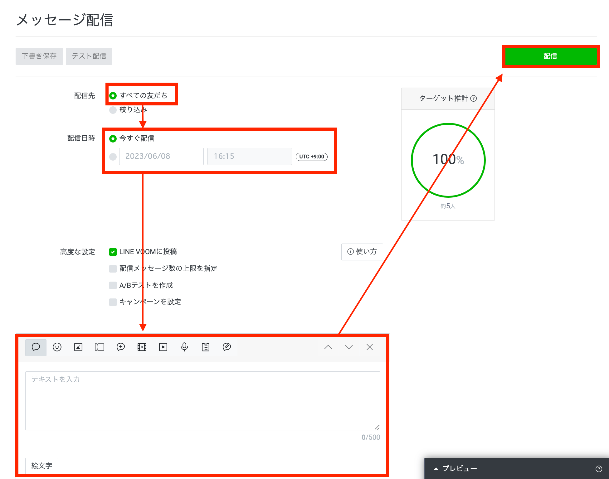 メッセージ配信画面が開いたら、【配信先:すべての友だち】【配信日時:今すぐ/日時予約】【配信メッセージ内容】を設定・入力します。その後、「配信」をクリックすれば完了です。