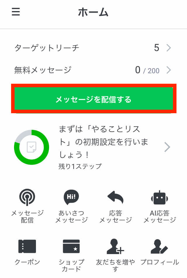 LINE公式アカウントのアプリを開き、該当アカウントの画面を選択し「メッセージを配信する」をタッチします。