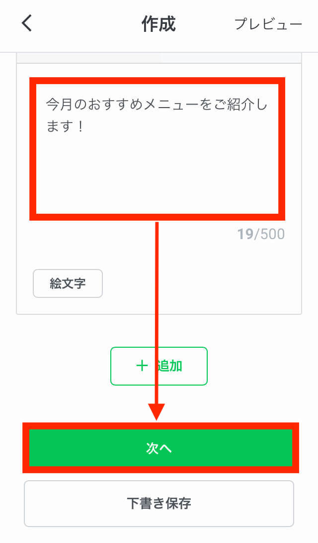 メッセージの内容を作成します。メッセージは3吹き出しまで追加可能です。メッセージを作成後、「次へ」をタップします。