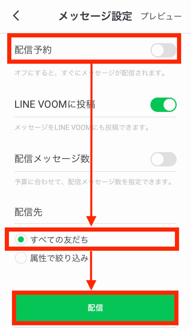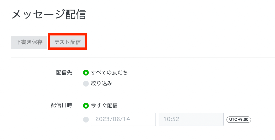 1つ目は配信予約です。オフにするとすぐにメッセージが配信されます。日時予約をする場合は、オンにして日時を設定します。