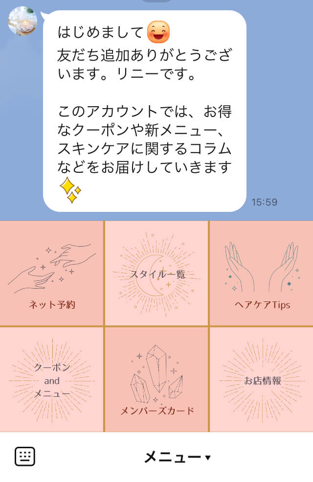 美容サロンでは、どのような情報を配信するかという案内や、リッチメニューで何ができるのかを紹介をします。そしてクーポンがある場合は忘れず送付しましょう。