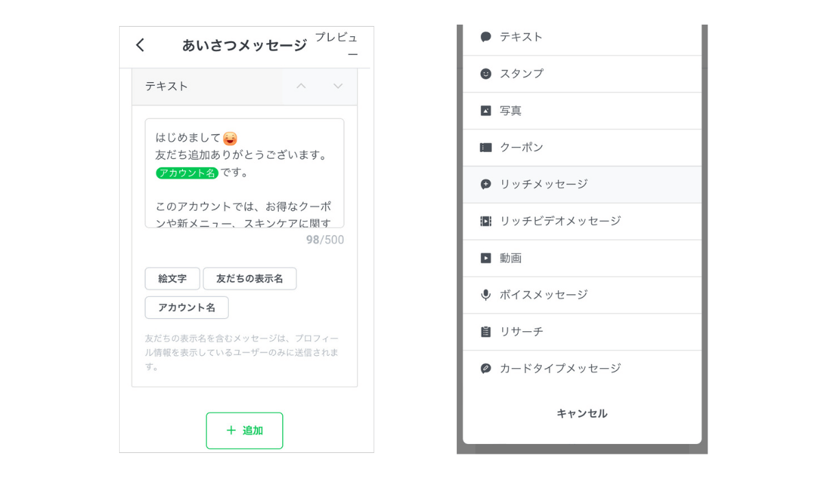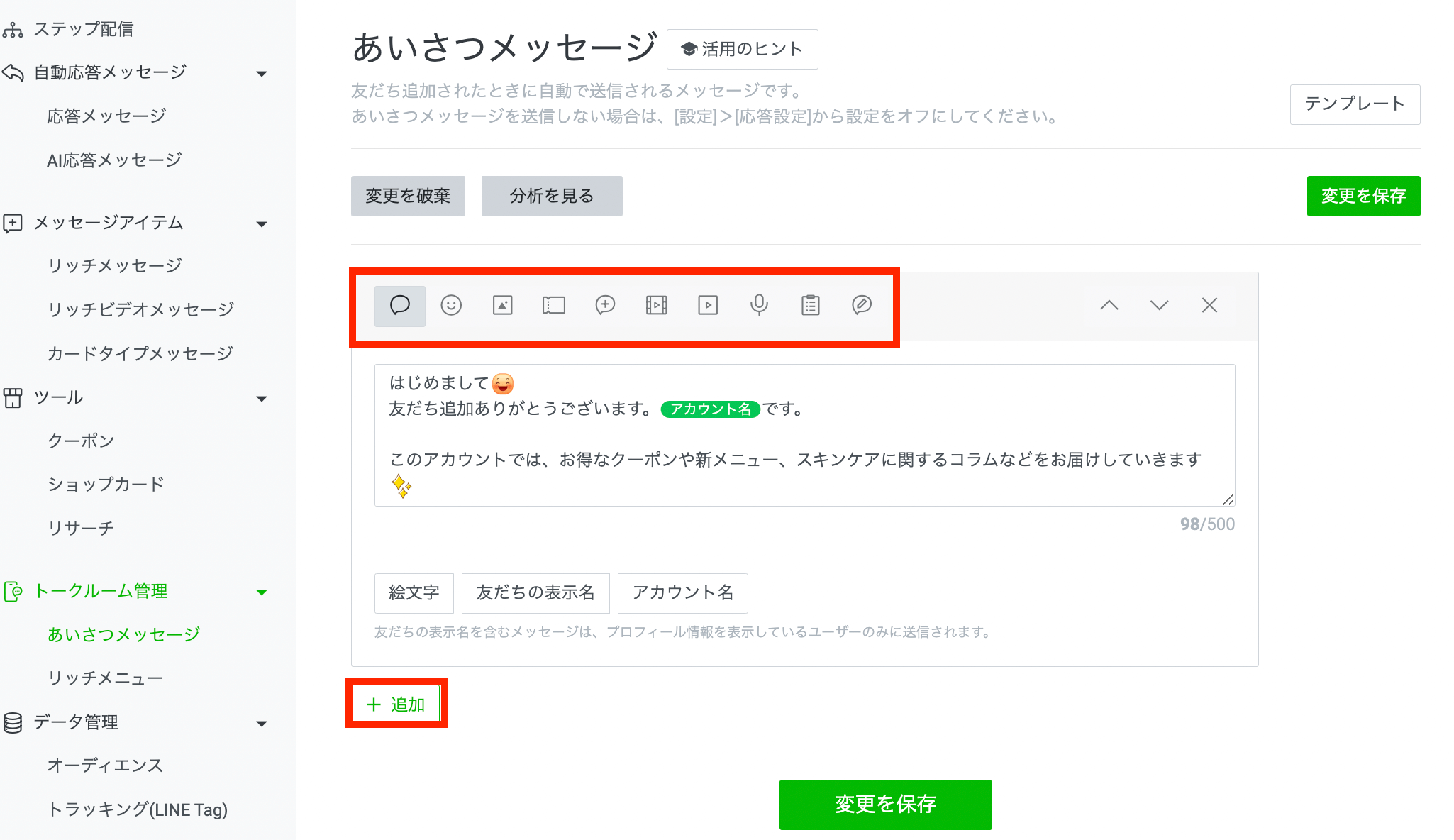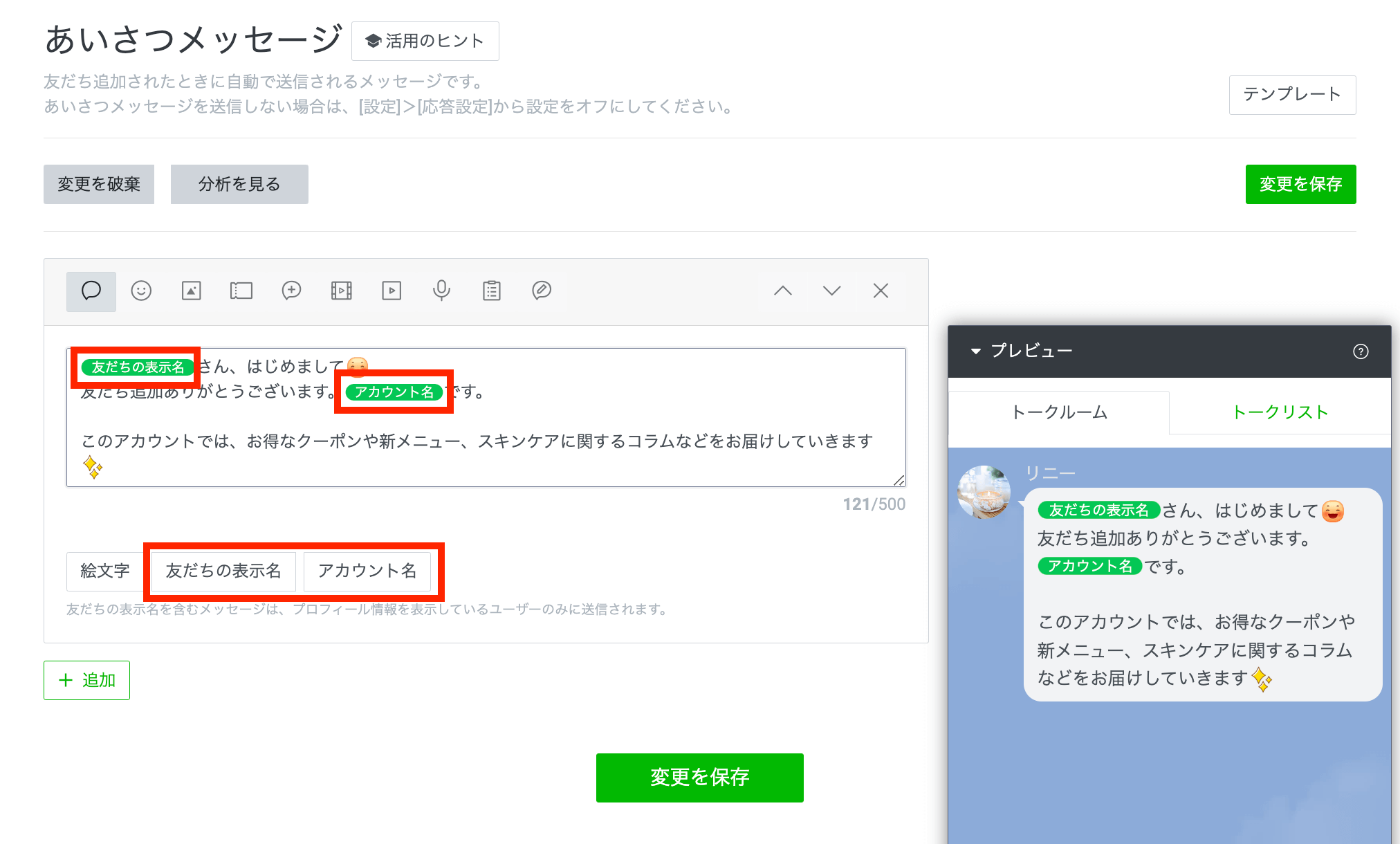 あいさつメッセージでは、通常のメッセージと異なり「友だち表示名」と「アカウント名」を追加できるボタンがあります。