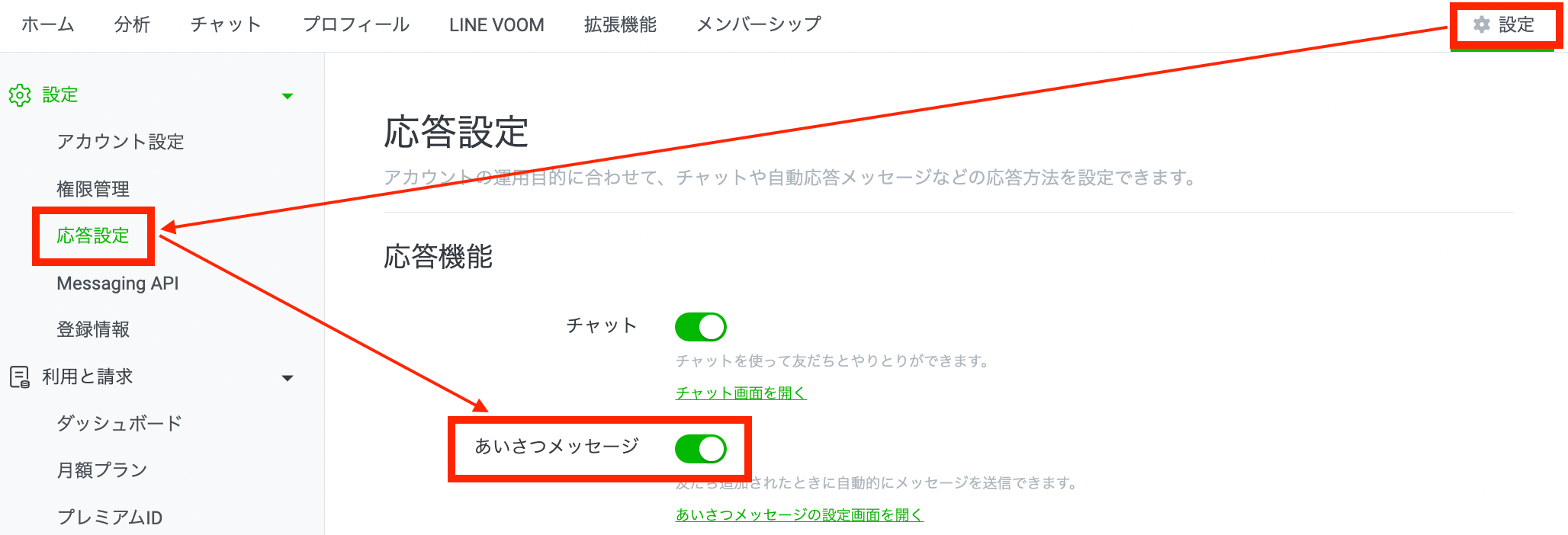 右上の「設定」>「応答設定」 > 「あいさつメッセージ」をオンにしてください。