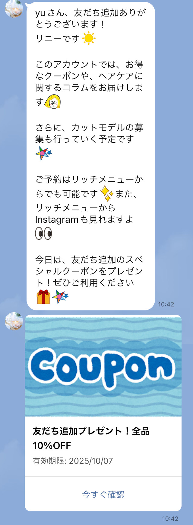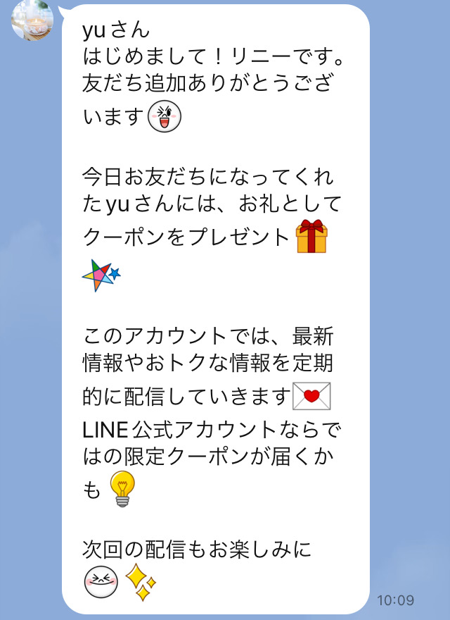 このアカウントでは、週に1回、最新情報やお得なクーポンを配信していきます(絵文字)