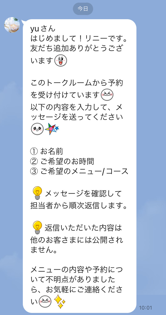 メニューの内容や予約について不明点がありましたら、お気軽にご連絡ください(絵文字)(絵文字)