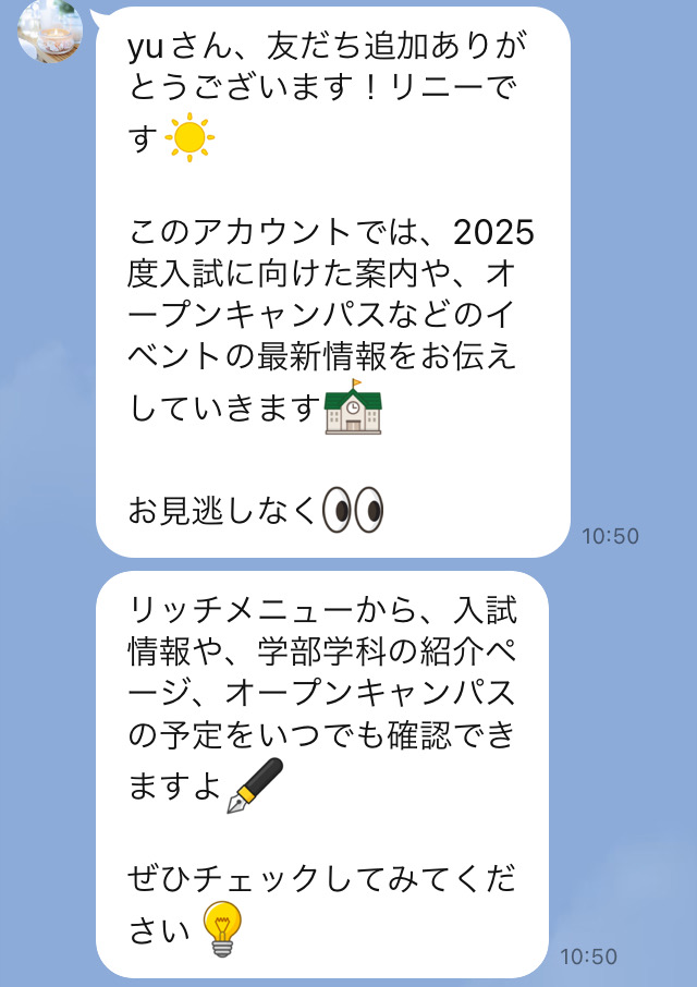 リッチメニューから、入試情報や、学部学科の紹介ページ、オープンキャンパスの予定をいつでも確認できますよ(絵文字)