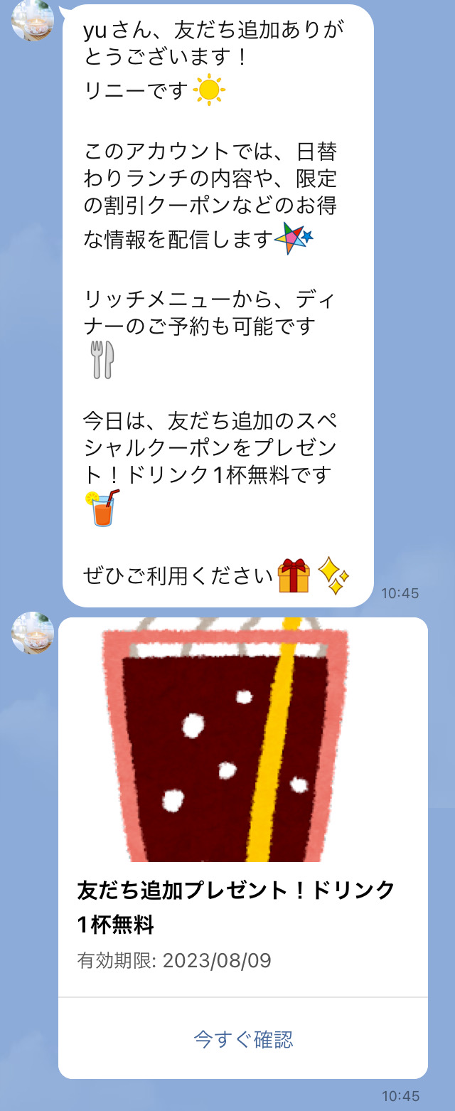 今日は、友だち追加のスペシャルクーポンをプレゼント!ドリンク1杯無料です(絵文字)
