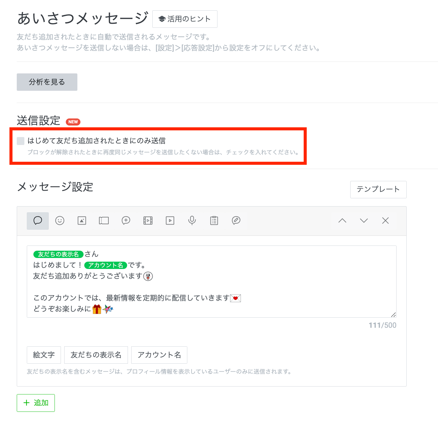 あいさつメッセージは、「はじめて友だち追加された時」と「ブロックが解除された時」に送信されます。もし、ブロックが解除された時に、再度あいさつメッセージを送信したくない場合は、以下の送信設定にチェックをつける必要があります。