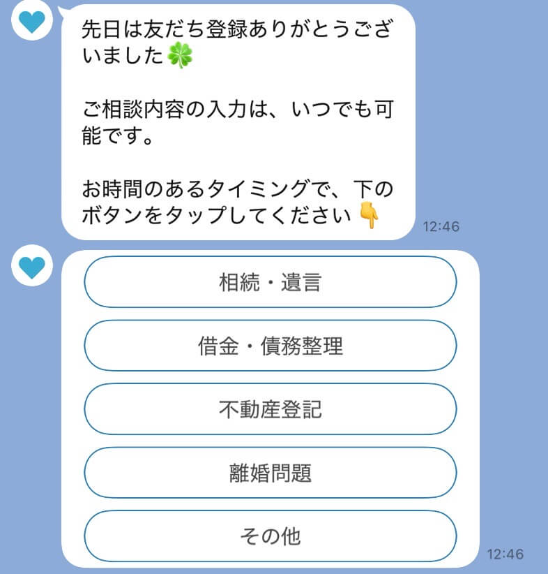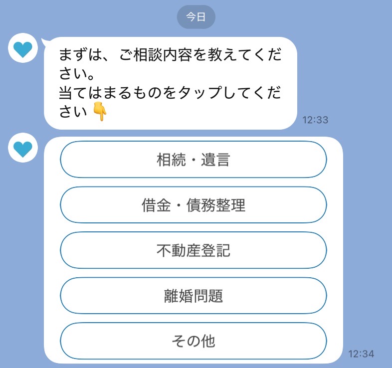 Linyを活用すると、友だち追加後に自動で案内を送り、ボタンをタップするだけで相談内容を選択できる導線が作れます。