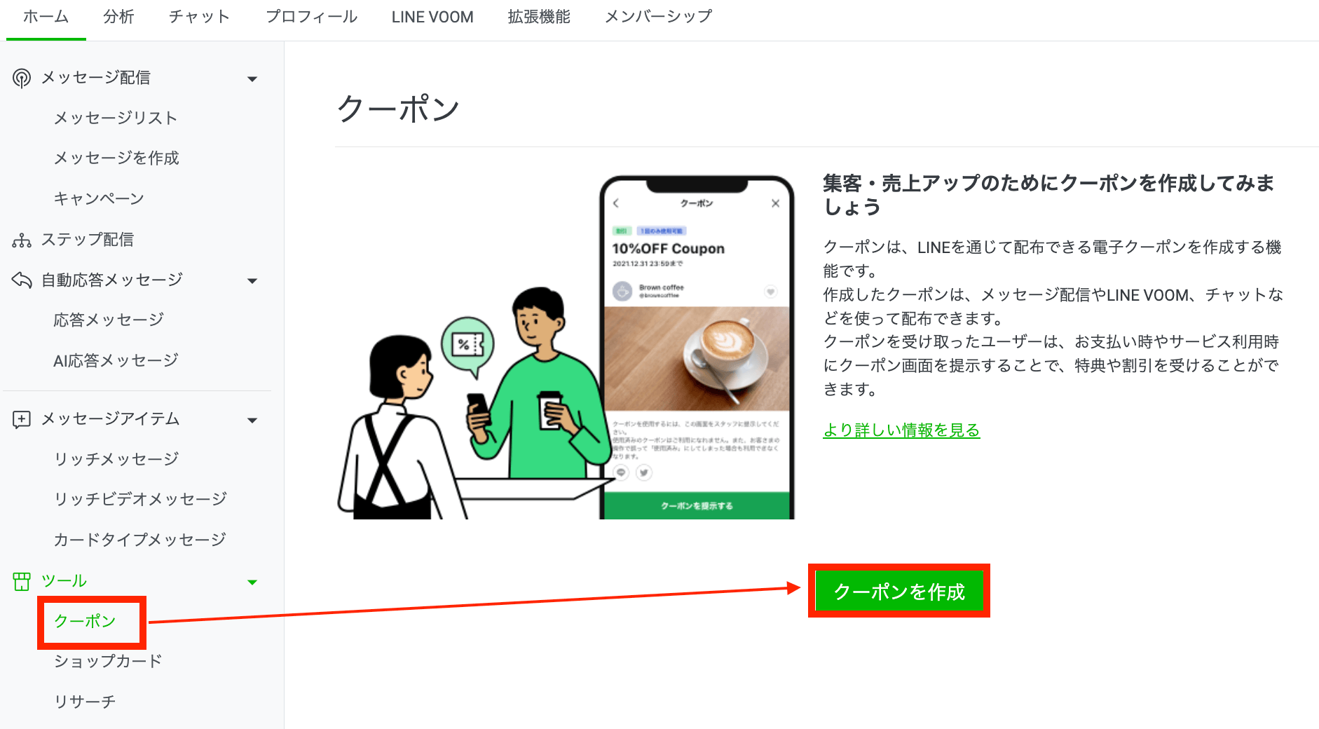 どのようなクーポンを送付するかが決まったら、LINE管理画面でクーポンの設定をしていきます。