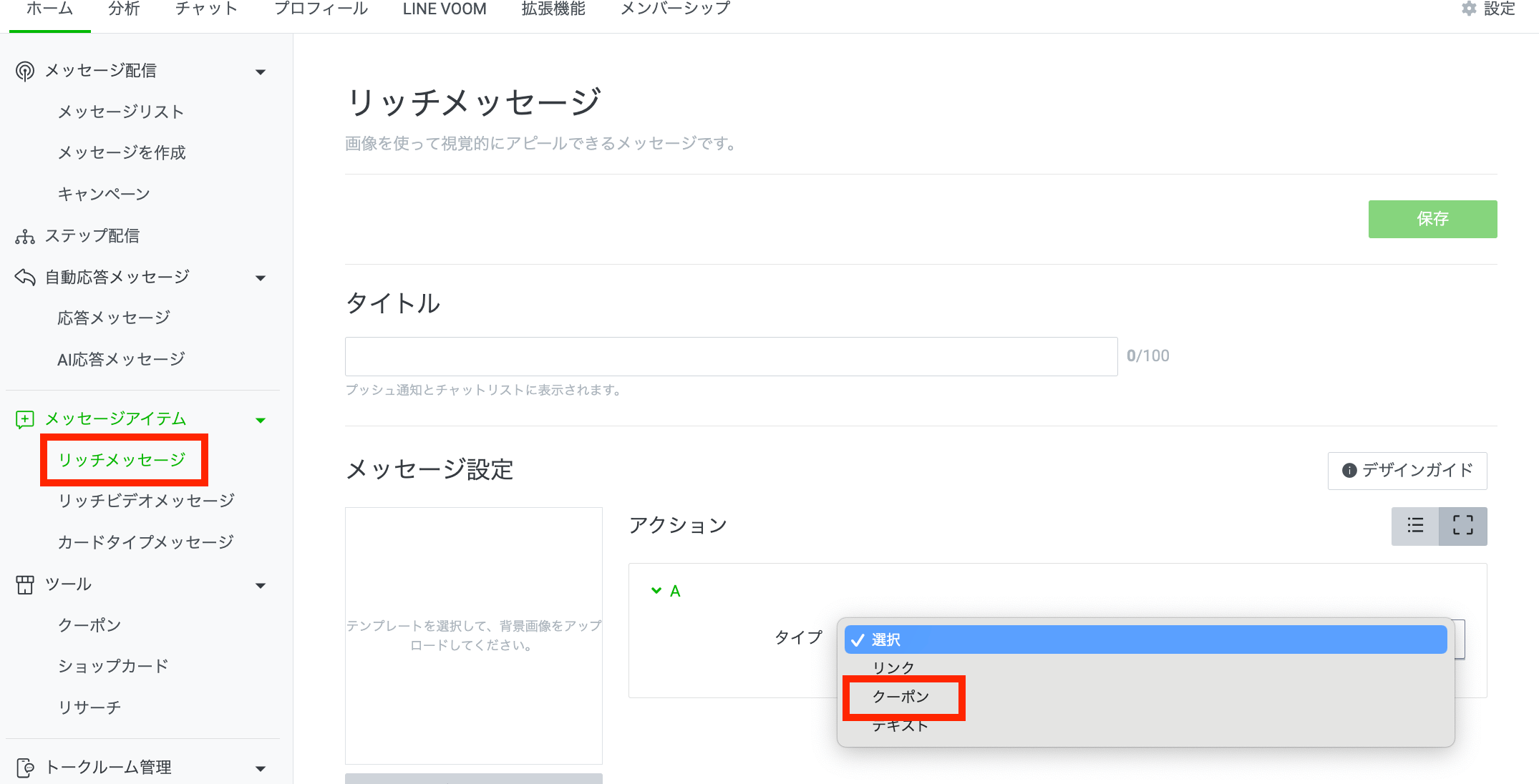 「リッチメッセージ」をクリックし、テンプレートの選択や、背景画像のアップロードなどを行い、アクションのタイプで「クーポン」を設定します。