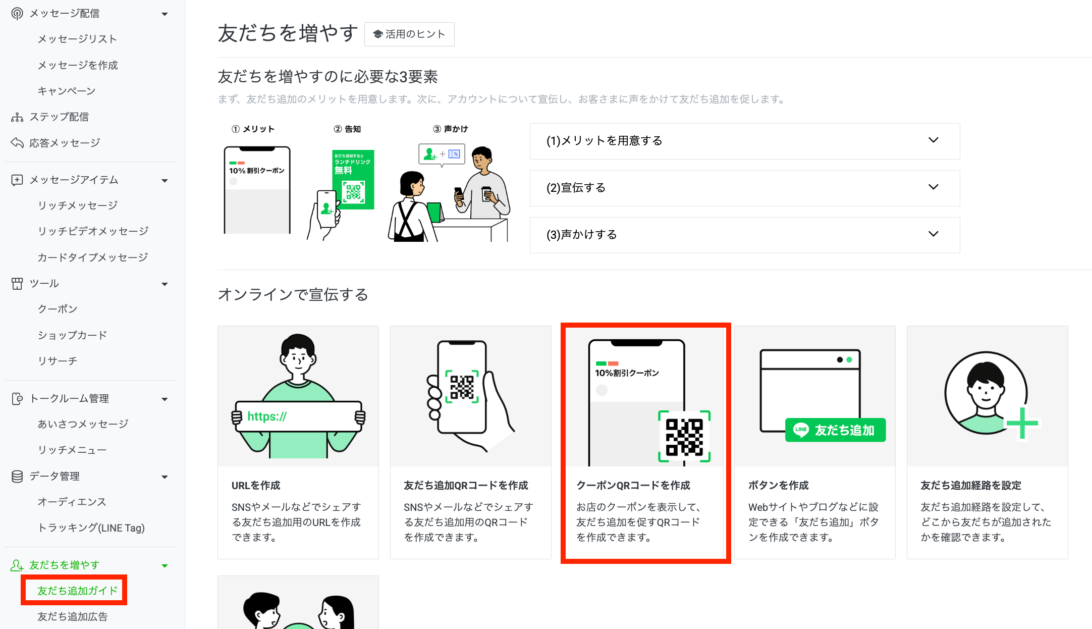 サイドメニューの「友だちを増やす」> 「友だち追加ガイド」を選択します。次に、友だち追加ガイドの画面から、「クーポンQRコードを作成」を選択します。