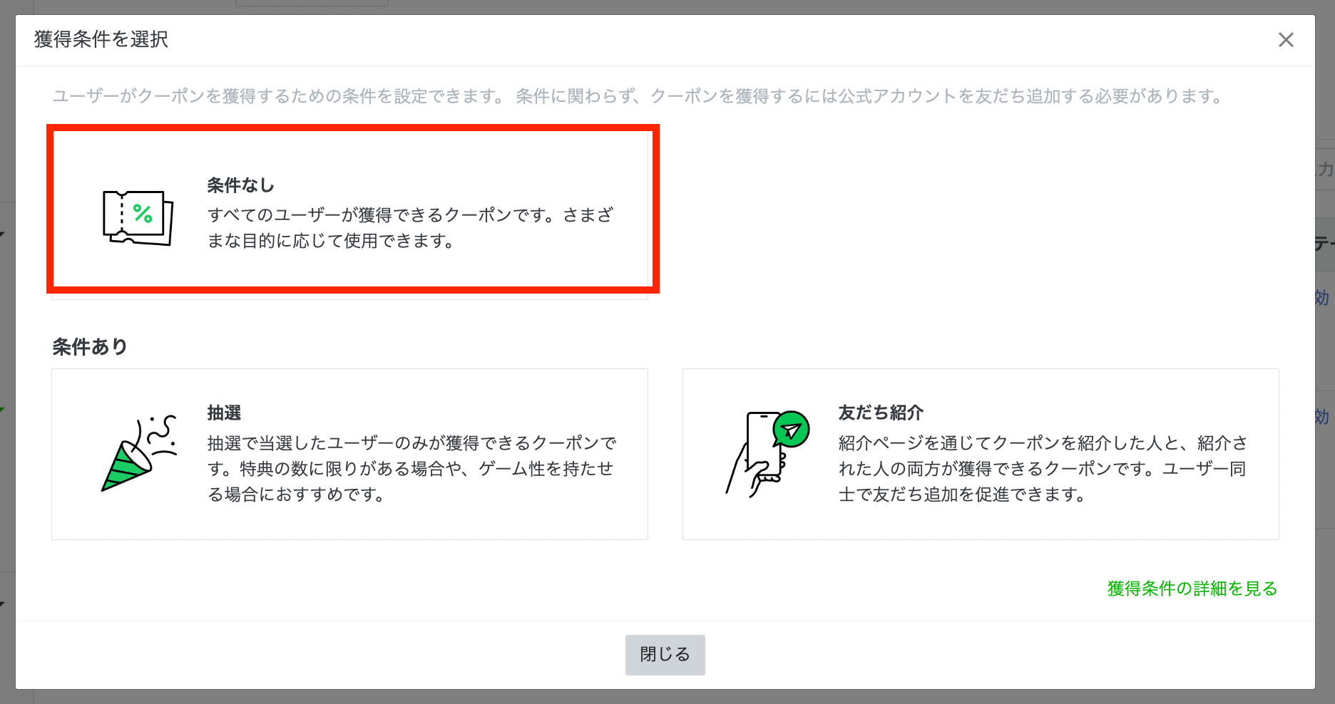 獲得条件を選択します。通常のクーポンの場合は、「条件なし」を選びます。