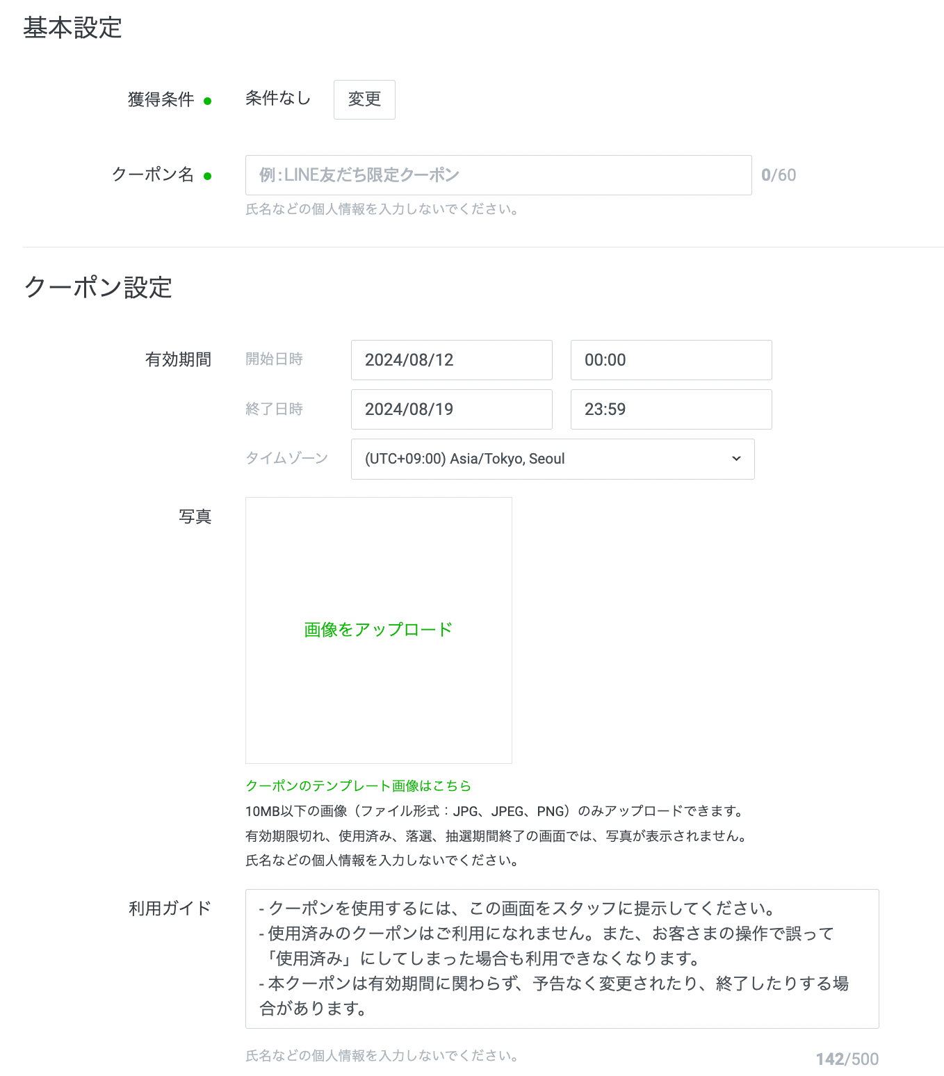 • クーポン名:友だちに表示される画面です。何のクーポンなのか分かりやすい名前にしましょう