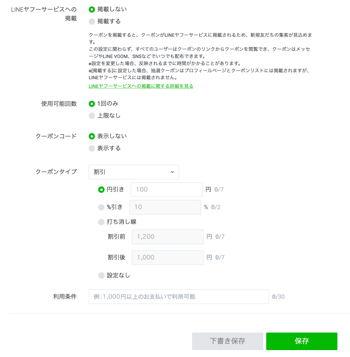 • LINEヤフーサービスへの掲載:「掲載する」を選んだ場合、クーポンがLINEヤフーサービスにも掲載されるため、新規友だちが獲得できる可能性があります