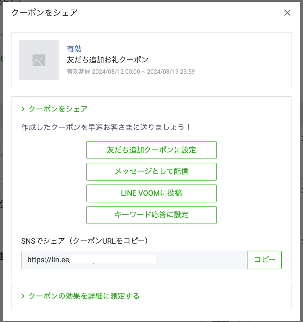 設定ができたら、「保存」をクリックして、クーポンの作成完了です。作成後に、クーポンの共有方法が表示されます。すぐにクーポンを公開したり、配信する場合は、この画面で該当の共有方法を選択します。