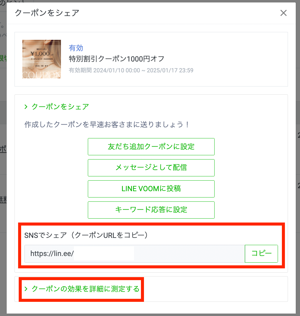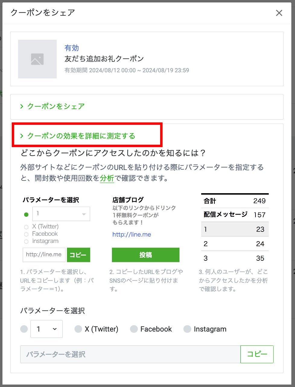 クーポンにパラメーターを設定することで、クーポンの開封数や使用回数を、掲載場所ごとで分析することができます。その場合は、「クーポンの効果を詳細に測定する」をクリックし、パラメーターを選択してください。