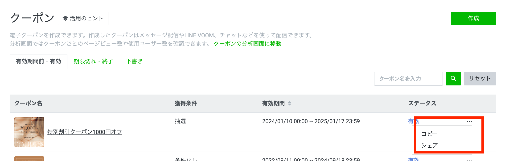 SNS・HP・ブログでシェアする場合は、クーポンの画面に行き、該当クーポンの右にある「…」をクリックして「シェア」を選択します。