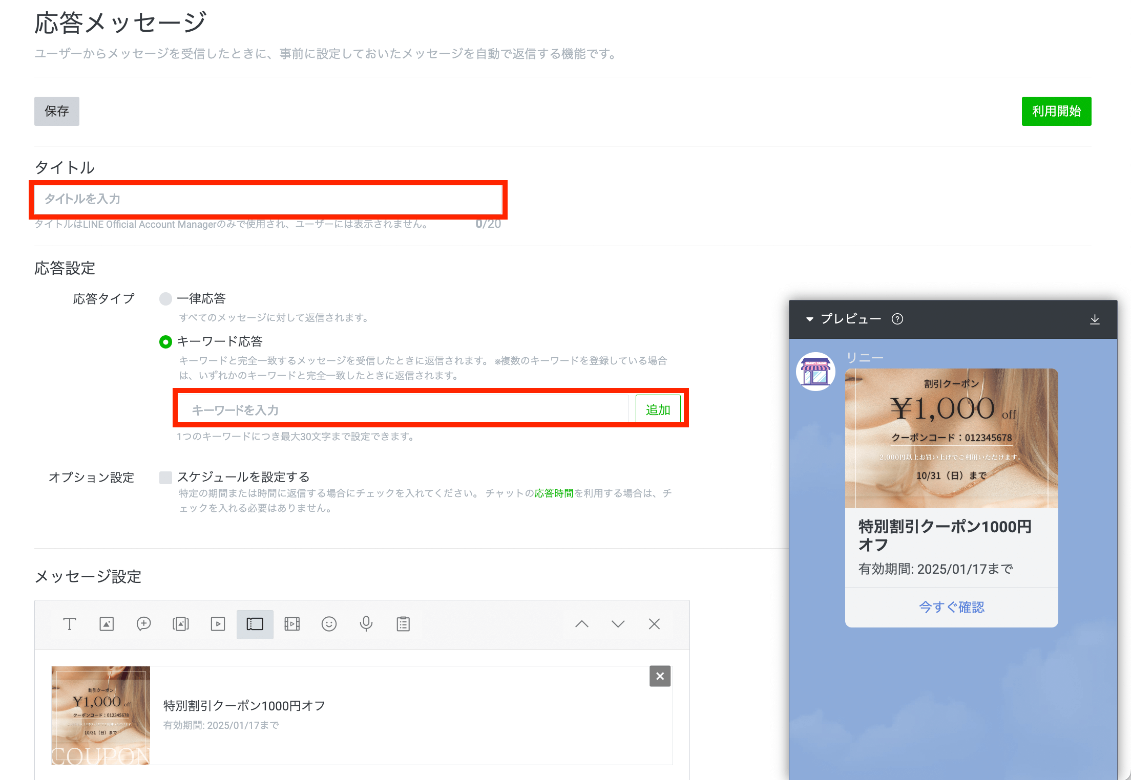 応答メッセージの設定画面に移動します。自動的にクーポンが設定された状態になっているので、「タイトル」と反応させる「キーワード」を設定します。