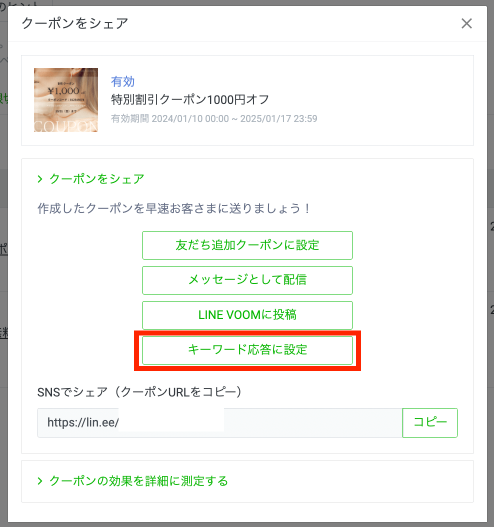 自動応答キーワード応答(キーワードに反応してクーポンを配布する)としても設定できます。