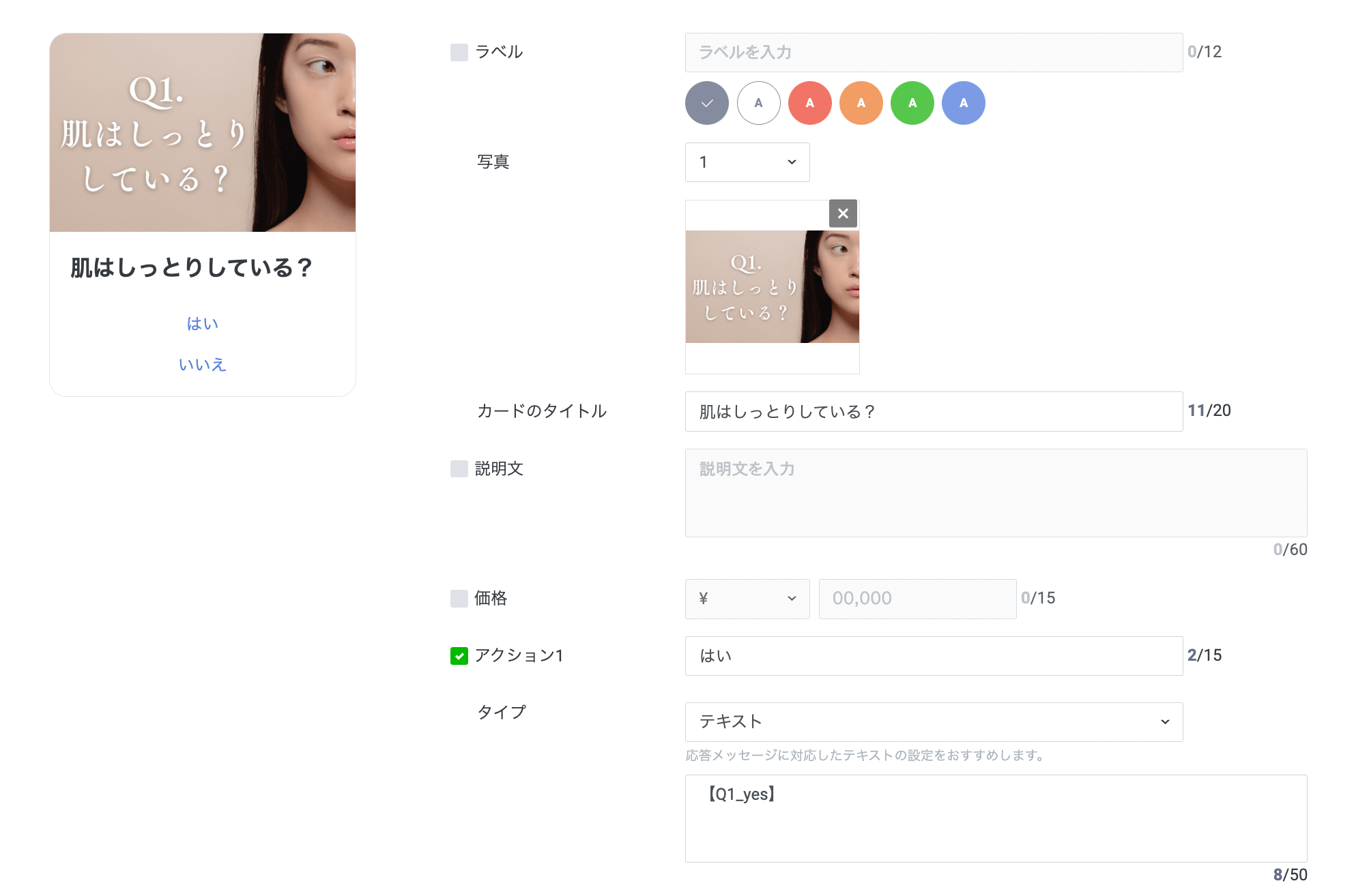 カードタイプの種類で「プロダクト」を選択すると、選択肢付きのメッセージが作成できます。アクションは「テキスト」を選択し、タップした時に表示させるテキストを設定します。このテキストを次のステップの自動応答のキーワードとして設定することで、次の質問を自動で表示させることができます。