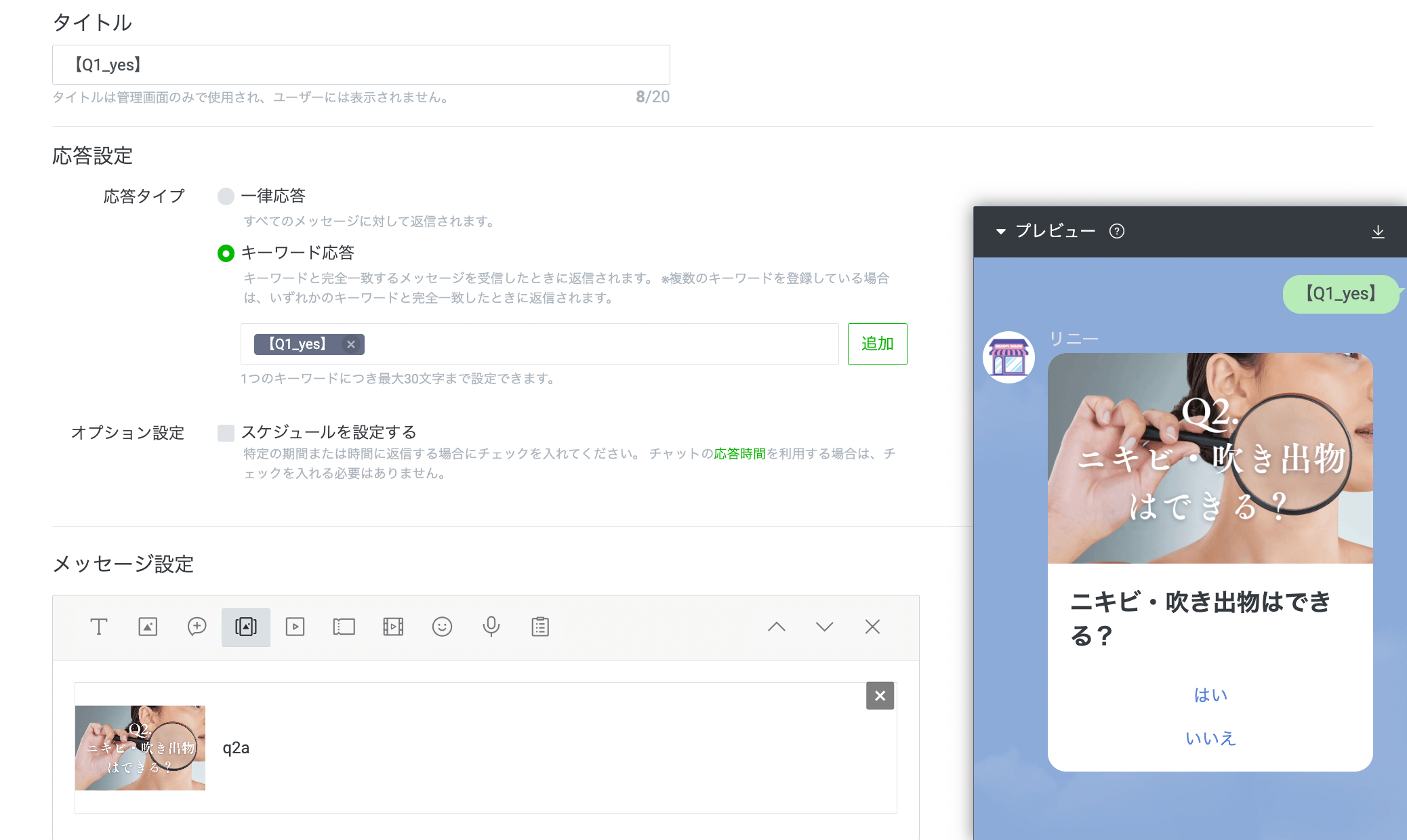 診断結果や質問が作成できたら、次に自動応答(応答メッセージ)を活用して、コンテンツを自動送信するための設定をしていきます。キーワードは先ほど「アクションのテキスト」で設定したテキストとなります。