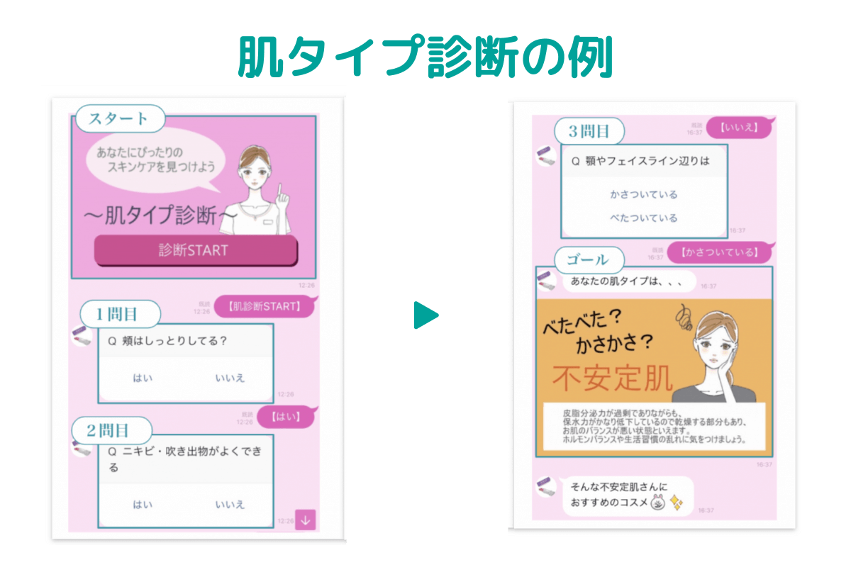 例えば、化粧品のLINE公式アカウントの場合、肌タイプ診断を実施して、ユーザーの肌タイプの診断結果を伝えると同時に、肌タイプに合った化粧品を案内することができます。自分のタイプに合った商品であれば、興味を持ち、詳細を確認するためにサイトを訪問する可能性が高まるでしょう。
