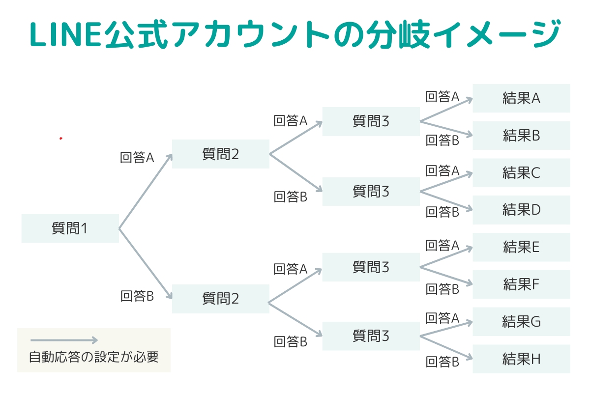 LINE公式アカウントではユーザーの回答を記憶することはできません。そのため、分岐ごとの「質問」と「自動応答」を設定する必要があり、設定の手間がかかります。そのため、一般的にLINE診断を作成する場合は、LINE公式アカウントと併用してLinyなどのサポートツールが用いられます。