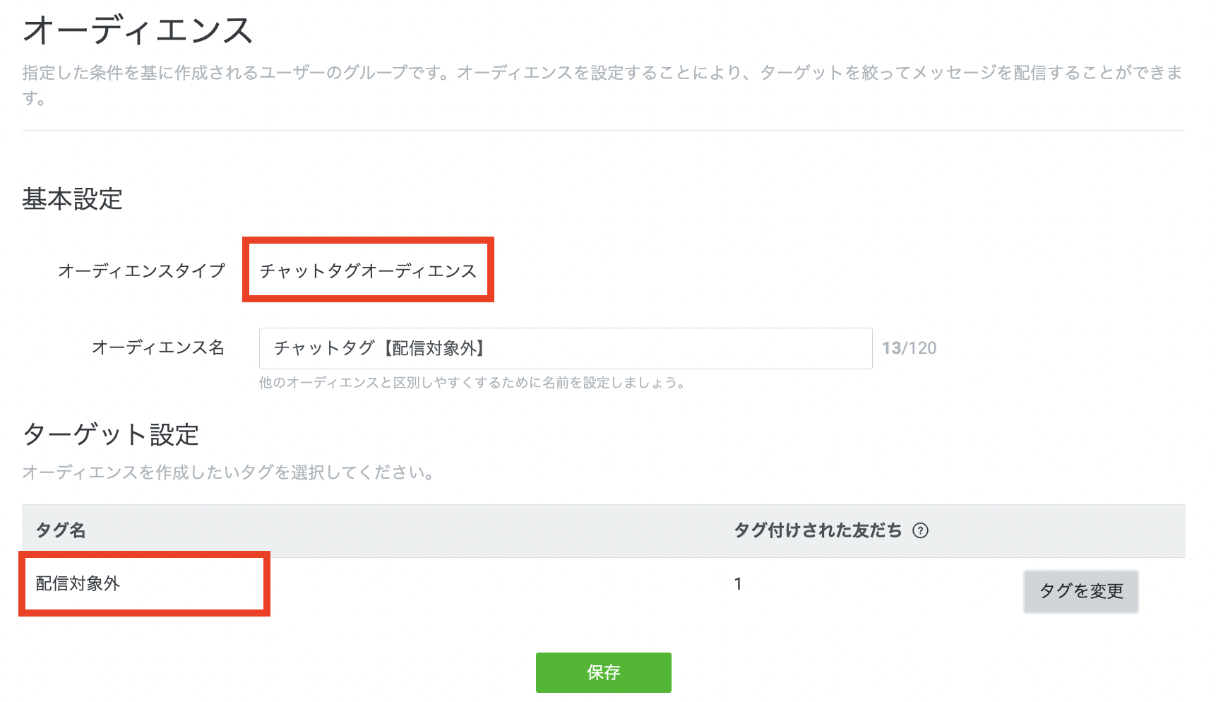 次は、オーディエンス機能を開きます。「作成」をクリックし、オーディエンスタイプで「チャットタグ」を選びます。そして、配信対象外用のタグを選択して保存します。