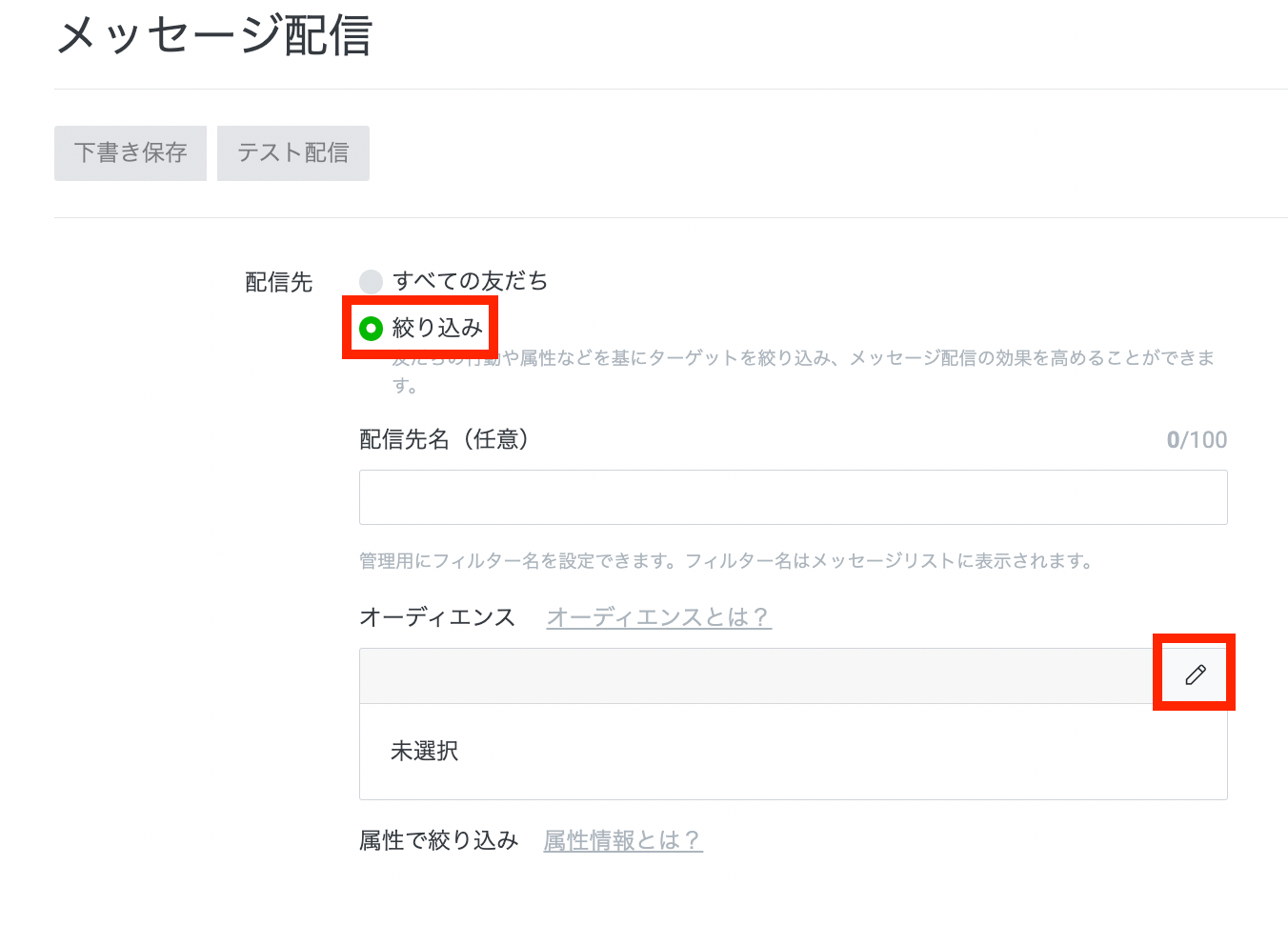 一斉配信をする際に、「絞り込み配信」>「オーディエンス」をクリックします。